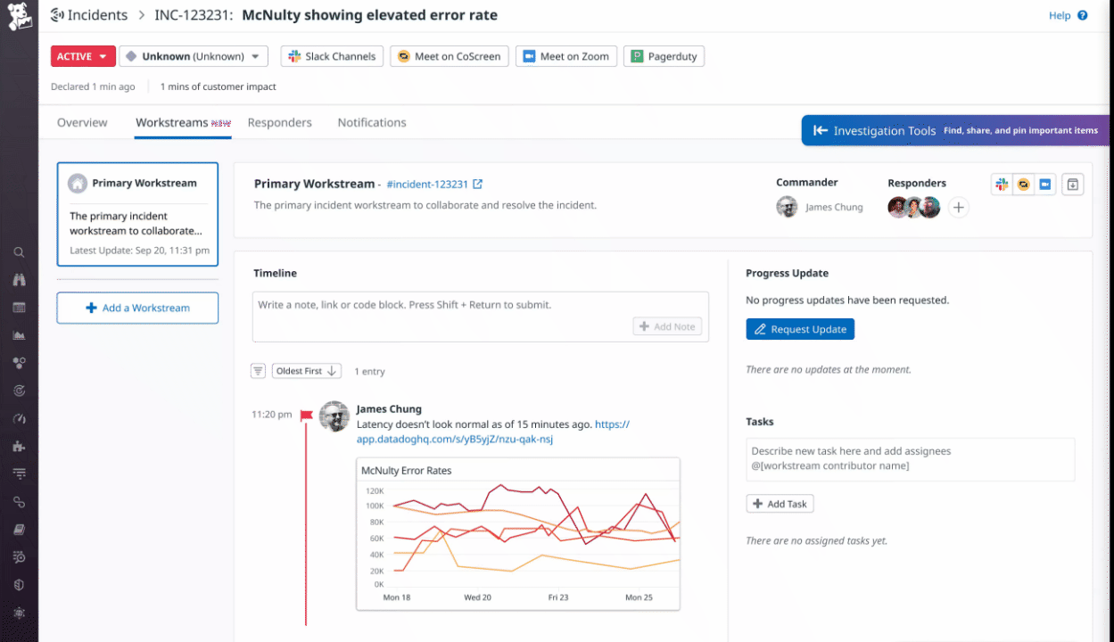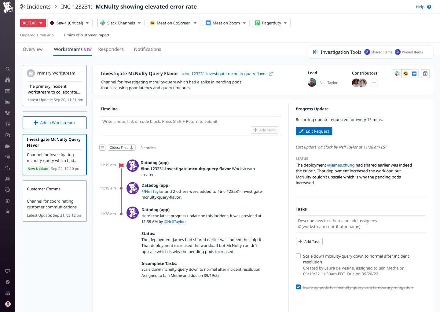 Responders using Slack can share information, complete tasks and provide ongoing progress updates that automatically sync with Datadog Incident Management.