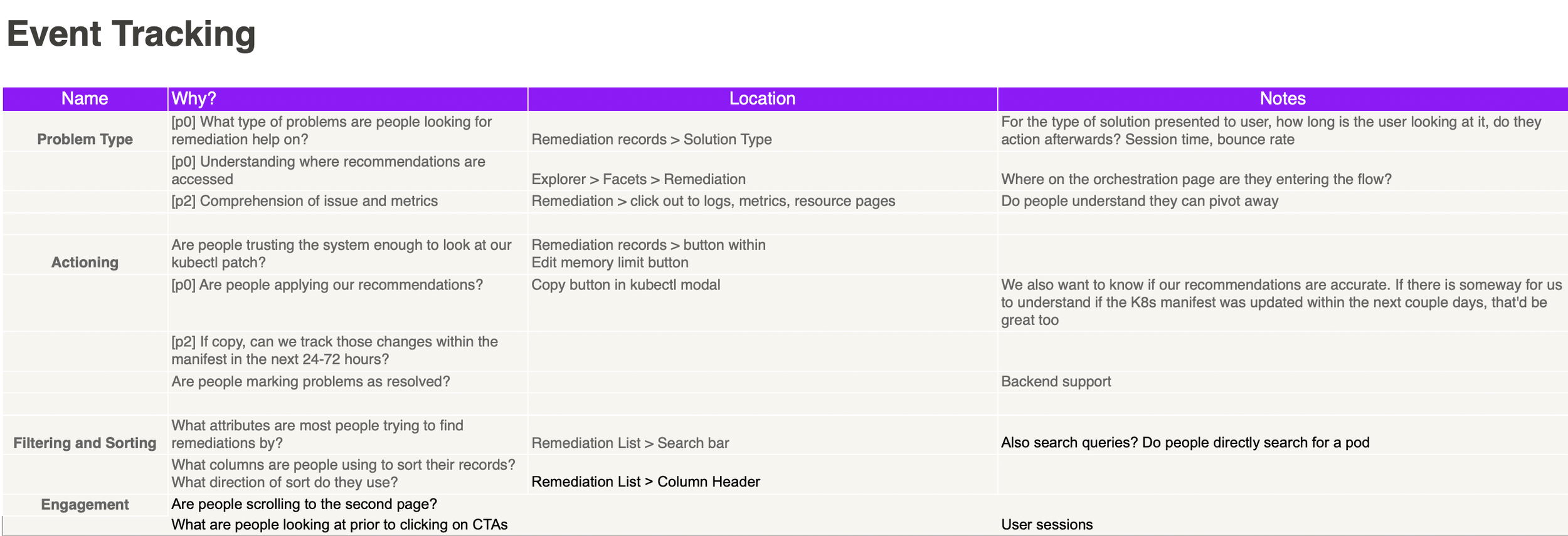• Product Requirements: Based on prior user and competitive research, the product manager distilled top priorities into a PRD for the quarter. We chose to focus on one to two core Kubernetes issues as a starting point.