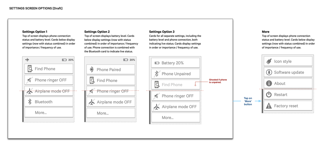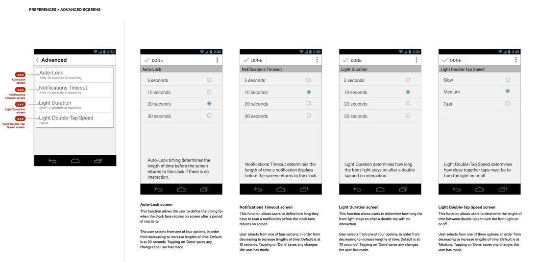 Once the sketches and the various approaches were thought out, we began designing the more detailed layouts and interactions of the various watch apps and the Android app. This captured the ideas in a much more tangible way.